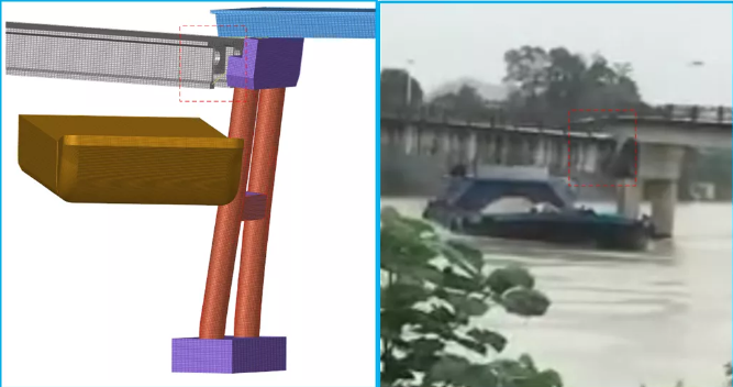 2021年7月13日,广东省广州市番禺区北斗大桥遭受货船撞击,事故发生后,由于北斗大桥被撞严重,检测工作不能全面展开,广东省交通规划设计研究院集团股份有限公司第一时间联系樊伟教授。樊伟教授立即组建北斗大桥船撞事故分析小组,基于有限资料,不到一周时间完成了北斗大桥船舶撞击事故仿真分析,分析结果很好地明确了被撞结构事故后的主要损伤及剩余承载能力,为事故后结构快速评估和维修做出了重要贡献。